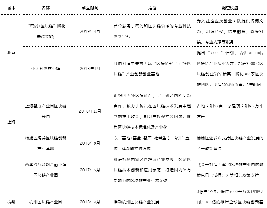 中關(guān)村創(chuàng)客小鎮(zhèn) 楊浦區(qū)灣谷區(qū)塊鏈創(chuàng)新產(chǎn)業(yè)基地 西溪谷互聯(lián)網(wǎng)金融小鎮(zhèn)區(qū)塊鏈產(chǎn)業(yè)園 杭州區(qū)塊鏈產(chǎn)業(yè)園 蟻米區(qū)塊鏈眾創(chuàng)空間 廣州區(qū)塊鏈國際創(chuàng)新中心
