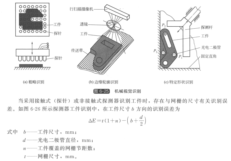 機(jī)械視覺(jué)識(shí)別如圖6-25所示,圖6-25(a) 為使用探針矩陣對(duì)工件進(jìn)行粗略識(shí)別,圖6- 25(b) 為使用直線性測(cè)量傳感器對(duì)工件進(jìn)行邊緣輪廓識(shí)別,圖6-25(c) 為使用點(diǎn)傳感技術(shù)對(duì) 工件進(jìn)行特定形狀識(shí)別。