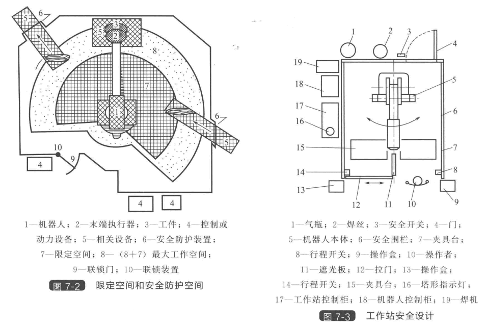 圖7-3是一個機器人焊接工作站關于安全措施設計的實例。